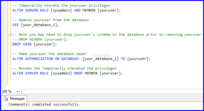 -- Temporarily elevate the youruser privileges ALTER SERVER ROLE [sysadmin] ADD MEMBER [youruser]; -- Remove youruser from the database USE [your_database_1]; -- Note you may need to drop youruser's schema in the database prior to removing youruser -- DROP SCHEMA [youruser]; DROP USER [youruser]; -- Make youruser the database owner ALTER AUTHORIZATION ON DATABASE::[your_database_1] TO [youruser]; -- Revoke the Temporarily elevated privileges ALTER SERVER ROLE [sysadmin] DROP MEMBER [youruser];