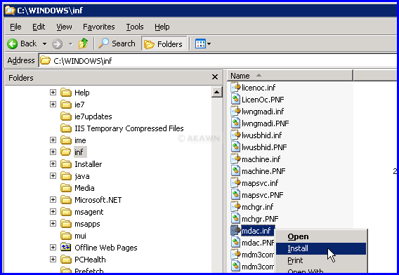 The resolution in this case was to locate, right click on C:\WINDOWS\inf\mdac.inf and select Install.